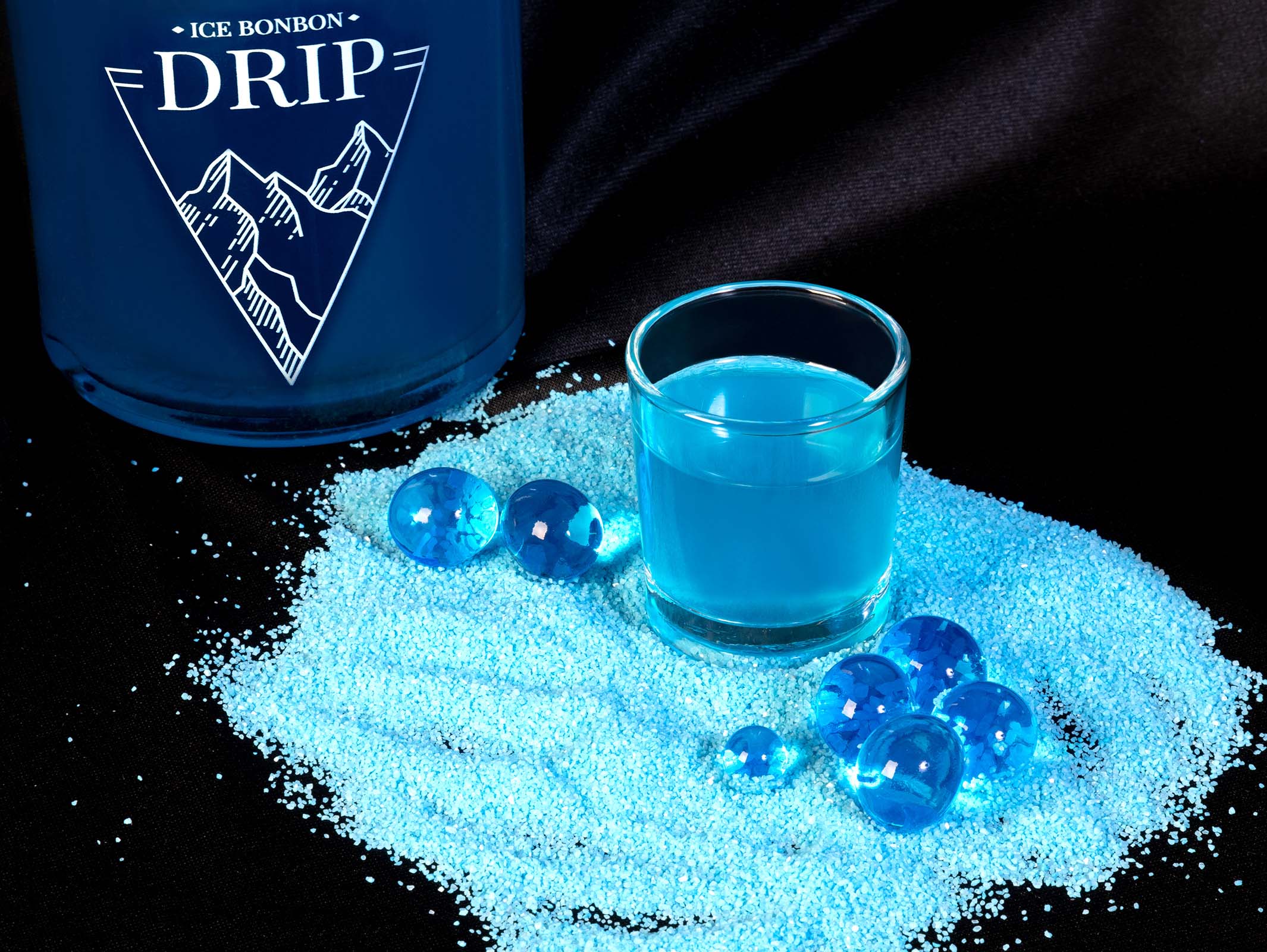 Die auffällige blaue Farbe von DRIP ist nicht nur ein optisches Highlight, sondern unterstreicht den eisigen Charakter des Likörs. Sie ist lebensmittelecht und sorgt für beeindruckende Drinks.